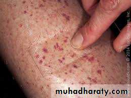The term purpura describes a larger macule or papule of blood in the skin. Such blood-filled lesions do not blanch if a glass lens is pushed against them