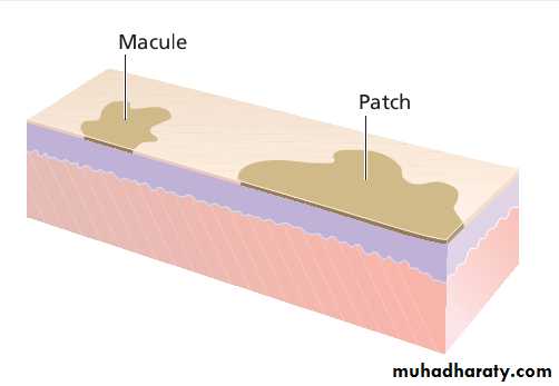 A macule is a small flat area, less than 5 mm in diameter, of altered colour or texture.A patch is a large macule.
