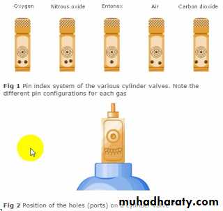 This non interchangeable safety system is known as the pin index system. There is a specific pin configuration for each medical gas on the yoke of the anaesthetic machine or regulator. The matching configuration of holes on the valve block allows only the correct gas cylinder to be fitted in the yoke.