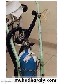 Entonox, a gas mixture of 50% oxygen and 50% nitrous oxide by volume, can be used to provide analgesia. It is compressed into cylinders to a pressure of 13700KPa.A two stage pressure demand regulator is attached to the cylinder. As the patient inhales through the mask or mouthpiece, gas flow is allowed to occur. Gas flow ceases at the end of an inspiratory effort.