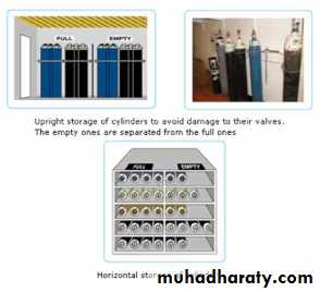 Because of the inherit dangers associated with working in the vicinity of pressurized cylinders, further safety procedures must be rigorously adhered to for the maintenance and storage of gas cylinders.Full cylinders should be separated from empty ones to avoid accidents. This is to avoid the risk of disrupting patient gas supply by accidentally connecting an empty cylinder.