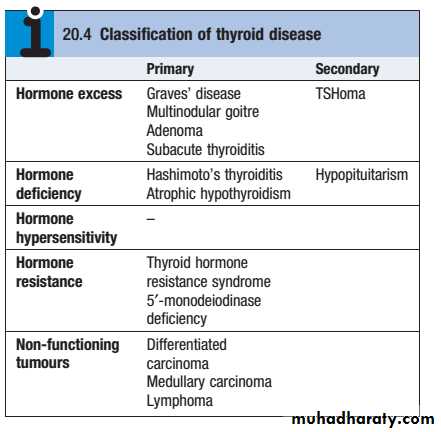 The most common presentations are hyperthyroidism (thyrotoxicosis), hypothyroidism and enlargement of the thyroid (goitre or thyroid nodule).Widespread availability of thyroid function tests has led to the increasingly frequent identification of patients with abnormal results who are either asymptomatic or have non-specific complaints such as tiredness and weight gain.