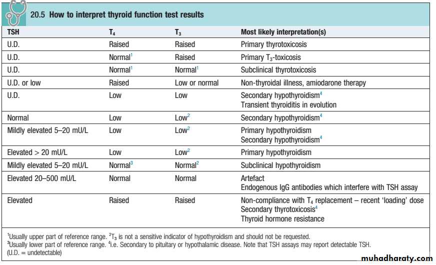 Common patterns of abnormal thyroid function test results and their interpretation are shown in the box below.Other modalities commonly employed in the investigation of thyroid disease include measurement of antibodies against the TSH receptor or other thyroid antigens ,radioisotope imaging, fine needle aspiration biopsy and ultrasound.