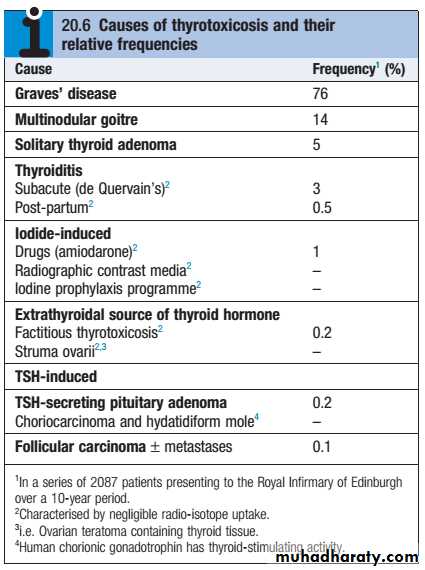 Thyrotoxicosis describes a constellation of clinical features arising from elevated circulating levels of thyroid hormone. The most common causes are Graves’ disease, multinodular goitre and autonomously functioning thyroid nodules (toxic adenoma) .Thyroiditis is more common in parts of the world where relevant viral infections occur, such as North America.