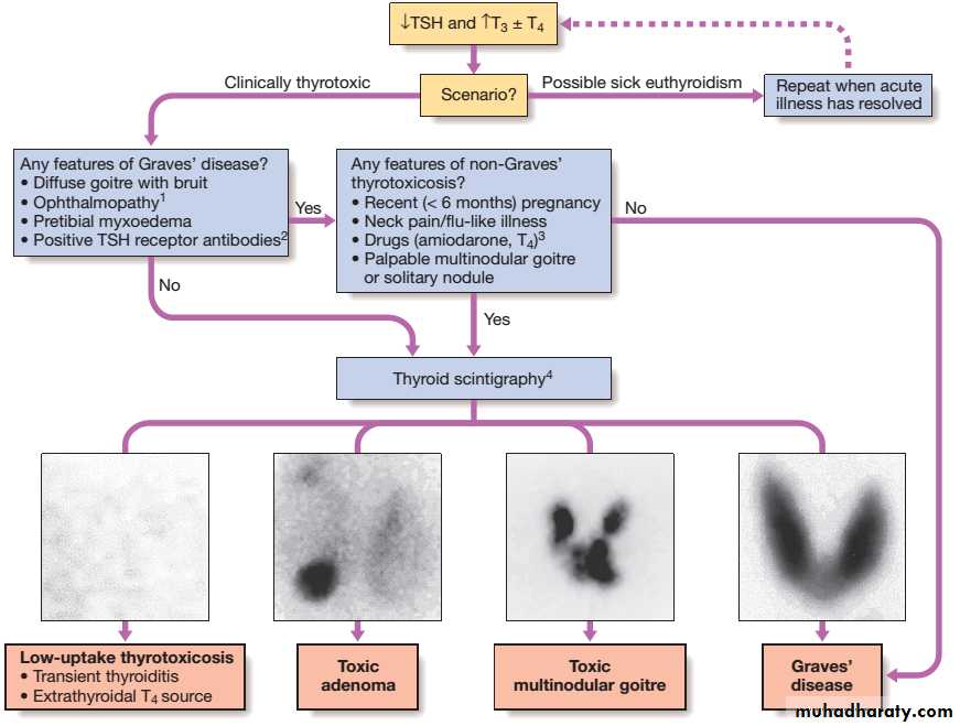1-The first-line investigations are serum T3, T4and TSH.2-measurement of TSH receptor antibodies (TRAb, elevated in Graves’ disease)