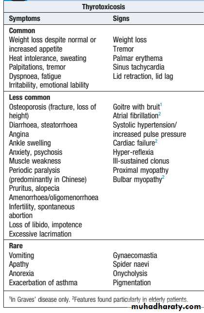 The most common symptoms are weight loss with a normal or increased appetite, heat intolerance, palpitations, tremor and irritability.Tachycardia, palmar erythema and lid lag are common signs.