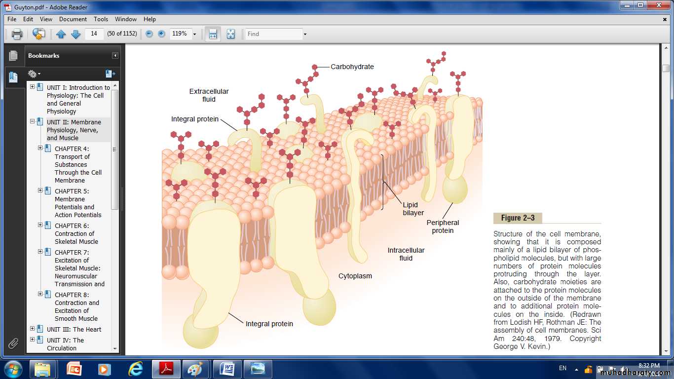 Fig: structure of the cell membrane, showing that it is composed mainly of a lipid bilayer of phospholipid molecules.but with large number of protein molecules protruding through the layer. Also carbohydrate molecules are attached to the protein molecules on the outside of the membrane and to additional protein molecule to the inside.