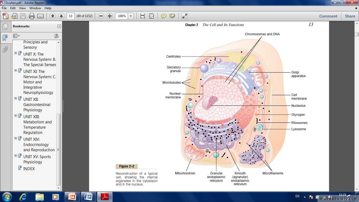 Most organelles of the cell are covered by membranes composed primarily of lipids and proteins. The lipids of the membranes provide a barrier that impedes the movement of water and water-soluble substances from one cell compartment to another because water is not soluble in lipids. Protein molecules in the membrane often do penetrate all the way through the membrane, thus providing specialized pathways, often organized into actual pores, for passage of specific substances through the membrane, other membrane proteins are enzymes that catalyze a multitude of different chemical reactions.Fig: Reconstruction of a typical cell, showing the internal organelles in the cytoplasm and in the nucleus.