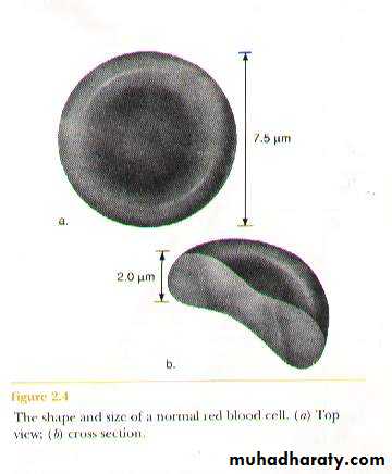 b.Shape of erythrocytes: they are biconcave discs which are thick at their edges. This shape: 1- gives the cell great flexibility & elasticity. 2- Allow it to fold when it has to move through very narrow blood capillaries. 3- Increases the surface area of the RBC’s . So all mature RBC’s are perfectly round, flat & smooth.