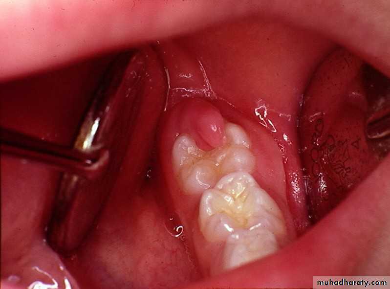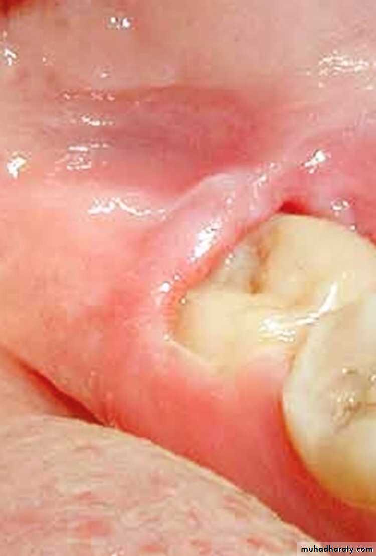 Pericoronitis produces rapid onset of soreness or pain in the soft tissues surrounding the crown of a partially irrupted tooth.In the case of impacted third molars particularly the lower ones this soreness is a associated with pain on swallowing and trismus these symptoms are particularly sever in cases of acute pericoronitis. Subacute pericoronitis Is also associated with soreness, pain on swallowing, and trims but their degree severity is milder than that of the acute phase of the disease.