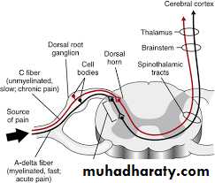 The presence of two pain pathways one slow and one fast explains the observation that there are two kinds of pain . A painful stimulus causes a sharp , localized sensation followed by a dull , intense diffuse and unpleasant feeling These sensations are variously called fast slow pain.Superficial And Deep Pain