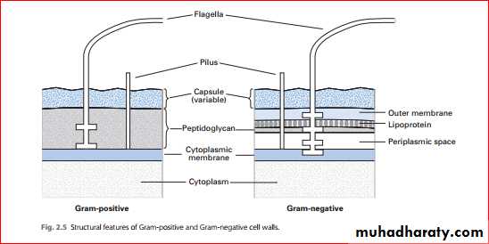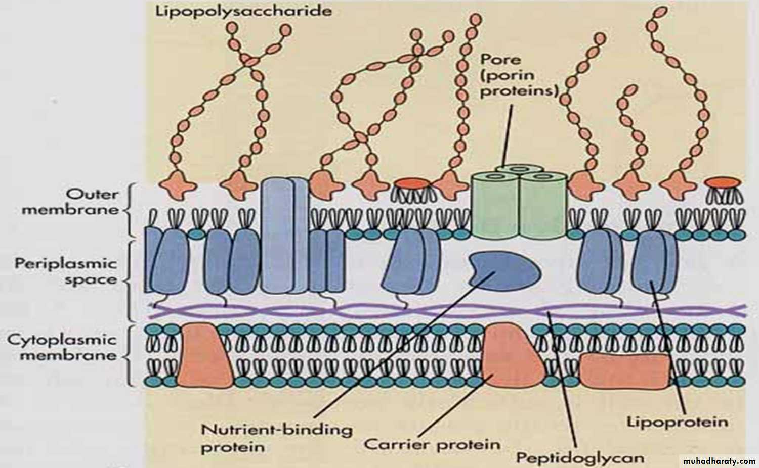 Inner peptidoglycan layer forms only 5-10% of the cell wall material.Outer membrane layer formed of Lipopolysaccharides: T he lipid portion (lipid A) is called endotoxin. It is released when the bacterial cells are lysed. It is highly toxic.