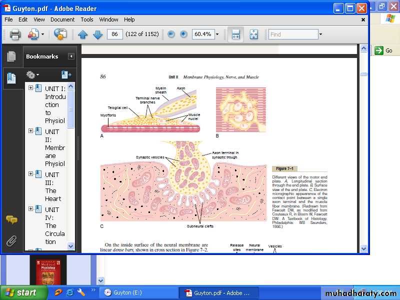 The nerve fiber forms a complex of branching nerve terminals that invaginate into the surface of the muscle fiber but lie outside the muscle fiber plasma membrane. The entire structure is called the motor end plate. The invaginated membrane is called the synaptic gutter or synaptic trough, and the space between the terminal and the fiber membrane is called the synaptic space or synaptic cleft. At the bottom of the gutter are numerous smaller folds of the muscle membrane called sub neural clefts, which greatly increase the surface area, at the nerve terminals there are many mitochondria that supply adenosine triphosphate (ATP), the energy source that used for synthesis of an excitatory transmitter acetylcholine. Acetylcholine(Ach) is synthesized in the cytoplasm of the nerve terminal. When a nerve impulse reaches the neuromuscular junction, Ach are released from the terminals into the synaptic space, In the synaptic space are large quantities of the enzyme acetyl cholinesterase, which destroys Ach a few milliseconds after it has been released from the synaptic vesicles. Ach stimulate calcium ions to diffuse from the synaptic space to the interior of the nerve terminal, calcium in turn stimulate more Ach vesicle release. Ach also stimulate the opening of acetylcholine-gated channels to allow large numbers of Na+ to pour inside the muscle fiber, carrying with them large numbers of positive charges. This creates a local positive potential change inside the muscle fiber membrane, called the end plate potential. Which in turn, initiates an action potential that spreads along the muscle membrane and thus causes muscle contraction.