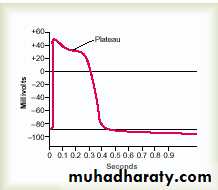 A second factor that may be partly responsible for the plateau is that the voltage-gated potassium channels are slower than usual to open, often not opening very much until the end of the plateau.This delays the return of the membrane potential toward its normal negative value of (–80 to –90 mv.).The role of Calcium Ions in action potential.