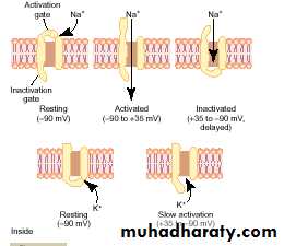 This channel has two gates—one near the outside of the channel called the activation gate, and another near the inside called the inactivation gate, in normal resting membrane (membrane potential is –90 millivolts.) the activation gate is closed, which prevents any entry of sodium ions to the interior of the fiber through these sodium channels.