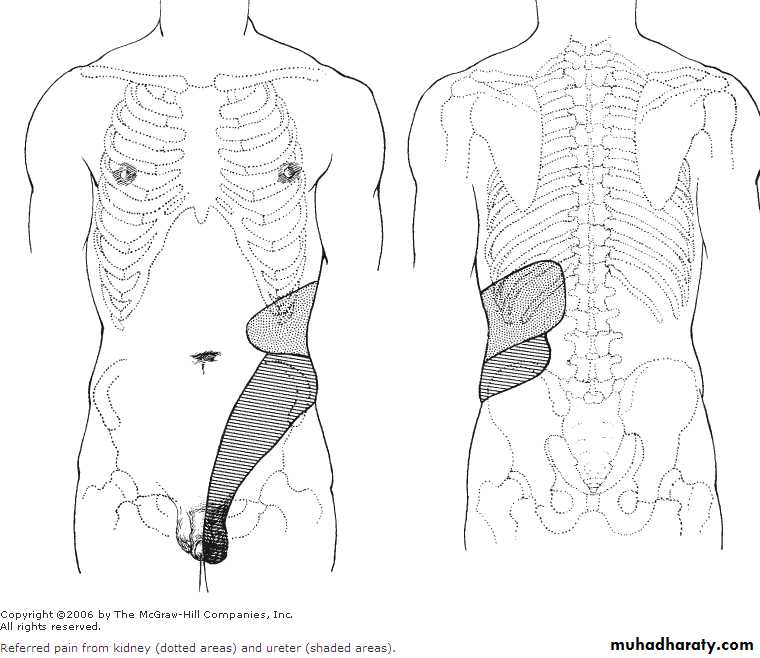 The site of ureteral obstruction can often be determined by the location of the referred pain. If the cause in the lower ureter the pain radiates to the testicle, labia or inner aspect of the thigh.