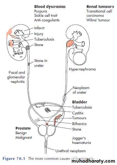 Blood appearing at the beginning of the urinary stream indicates a lower urinary tract cause.uniform staining throughout the stream points to a cause higher up.