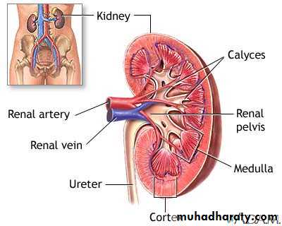 AnatomyExtra peritoneal system, composed of two kidneys located in the upper abdomen protected by thoracic cage. - Each weighs about 150 g.Each kidney supplied by main renal artery from aorta, divided into 5 segmental branches and drained by renal vein to the inferior vena cava.