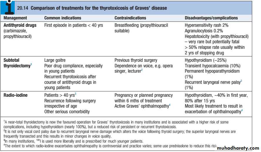 Management:Symptoms of thyrotoxicosis respond to β-blockade but definitive treatment requires control of thyroid hormone secretion.