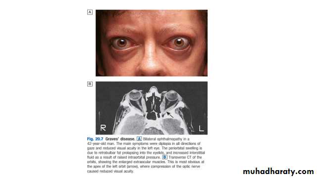 This condition is immunologically mediated but the autoantigen has not been identified. The eye is displaced forwards (proptosis, exophthalmos)and in severe cases there is optic nerve compression.