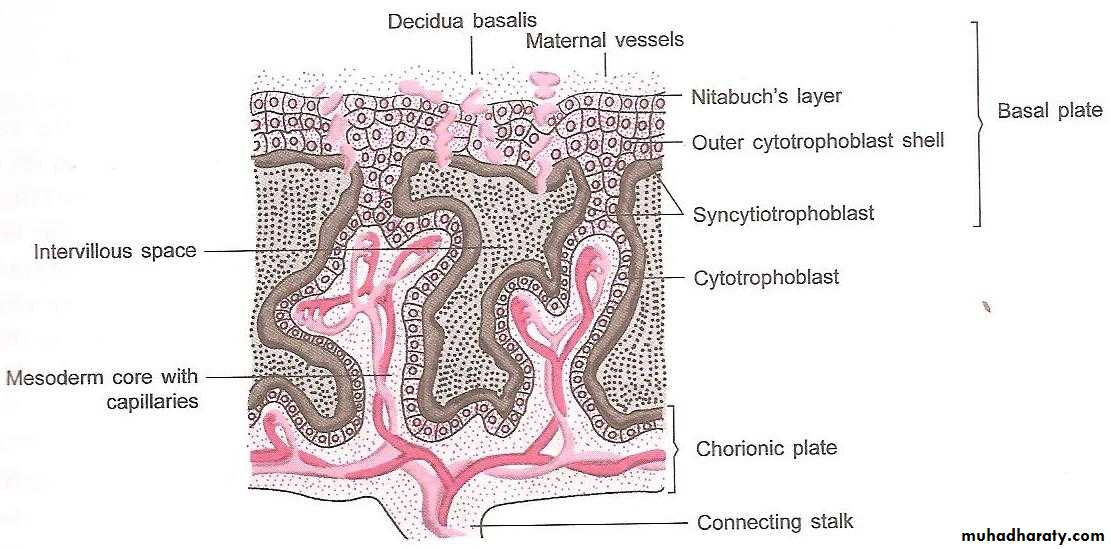 In human placenta the trophoblast erodes into the decidua, so that the endothelium of the maternal blood vessels is destroyed & maternal blood is in direct with the chorion, without the intervention of any decidual tissue (haemochorial placenta).The trophoblast soon arranged in trabeculae, which are covered by syncytiotrophoblast.When the embryonic mesoderm appears it extends into each of these trabecula & finally the vascularization of the mesoderm complete the formation of chorionic villi by about the 16th day after fertilization.