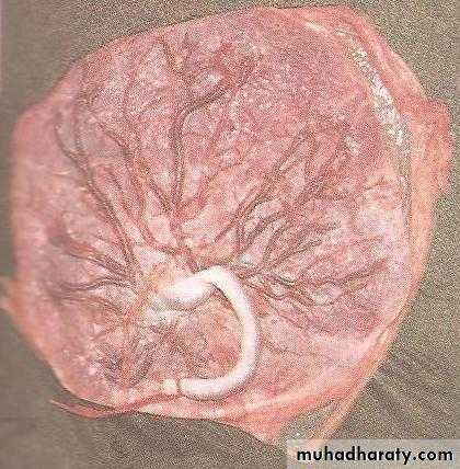 -Abnormal insertion of the cord: The cord usually attached to the centre of the placenta, but sometimes attached to the edge of placenta ( squash racket placenta) of no clinical importance. In very rare cases the cord is attached to the membrane at some distance from the edge of the placenta, at this point the vessel may divide into branches which run on the membrane before reaching the placenta (velamentous insertion of the cord ).