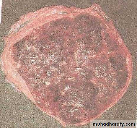 Fetal surface has a central depressed zone surrounded by a usually complete thickened white ring made up of double fold of amnion and chorion