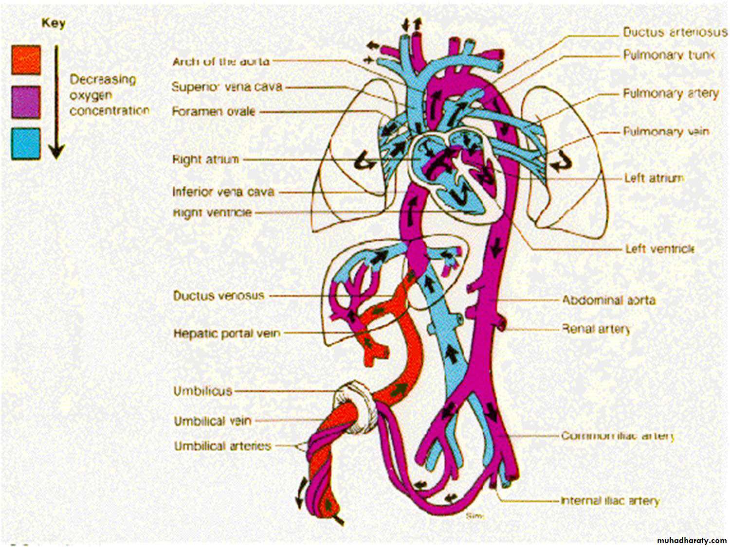 2-the right and left ventricles wok in parallel rather than in series.3-the heart ,brain and the upper body receive blood from the left ventricle , while the placenta and lower body receive blood from both right and left ventricles.