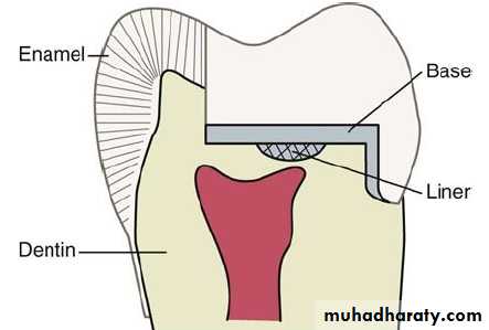 • liner or base is a material that can be placed on the pulpal surface of a cavity. It must cover the exposed dentinal tubules and act as protective barriers between dentine (and sometimes pulp) and the restorative material.