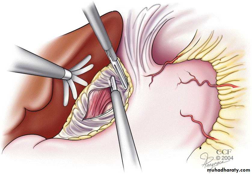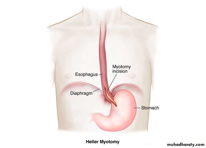 D. Myotomy ('Heller's operation'), performed either as an open operation or (increasingly) laparoscopically, is an extremely effective although more invasive option. Both pneumatic dilatation and myotomy may be complicated by gastro-oesophageal reflux, and this can lead to severe oesophagitis because oesophageal clearance is so poor in these patients. For this reason Heller's myotomy is accompanied by a partial fundoplication anti-reflux procedure. Proton pump inhibitor therapy is also often necessary.Recently an endoscopic method for myotomy was introduced particullarty for certain types of achalasia and called (peroral endoscopic myotomy).