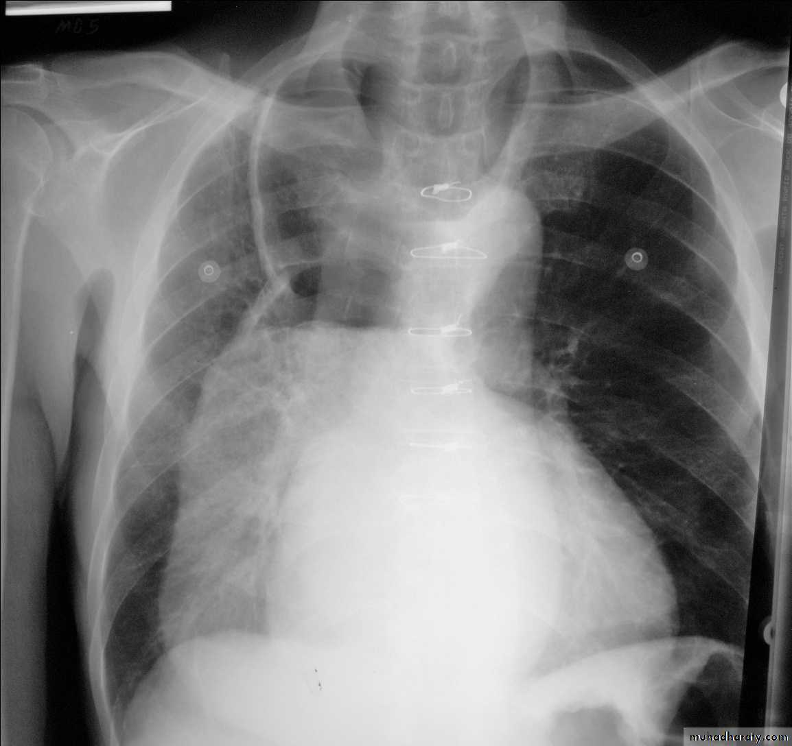 • A chest X-ray may be abnormal in late disease, with widening of the mediastinum from gross oesophageal dilatation and features of aspiration pneumonia.