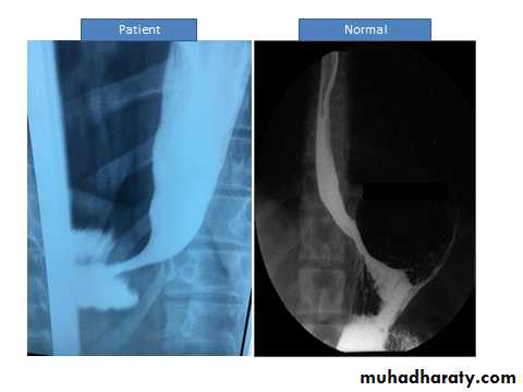 • A barium swallow shows tapered narrowing of the lower oesophagus. In late disease the oesophageal body is dilated, aperistaltic and food-filled.