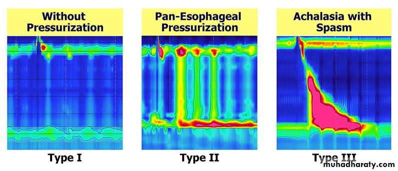 • Manometry confirms the high-pressure, non-relaxing lower oesophageal sphincter with poor contractility of the oesophageal body