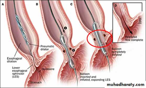 • Forceful pneumatic dilatation using a 30-35 mm diameter fluoroscopically positioned balloon disrupts the oesophageal sphincter and improves symptoms in 80% of patients. Some patients require more than one dilatation but those requiring frequent dilatation are best treated surgically.