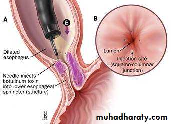 2) Endoscopically directed injection of botulinum toxin into the lower oesophageal sphincter induces clinical remission, but late relapse is common.