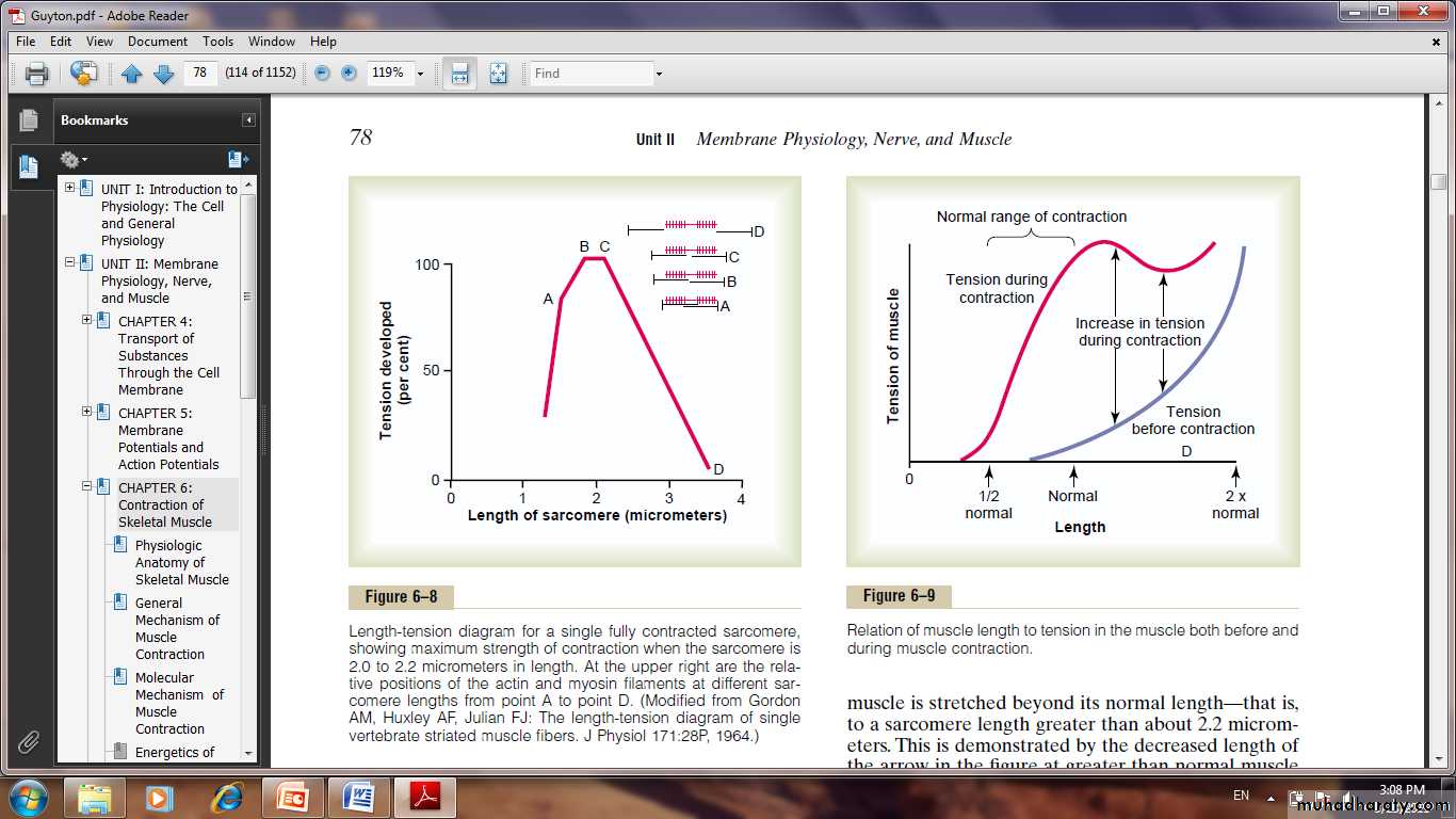 point, the tension developed by the activated muscle is zero. Then, as the sarcomere shortens and the actin filament begins to overlap the myosin filament, the tension increases progressively until the sarcomere length decreases to about 2.2 micrometers. At this point, the actin filament has already overlapped all the cross-bridges of the myosin filament but has not yet reached the center of the myosin filament. With further shortening, the sarcomere maintains full tension until point B is reached, at a sarcomere length of about 2 micrometers. At this point, the ends of the two actin filaments begin to overlap each other in addition to overlapping the myosin filaments. As the sarcomere length falls from 2 micrometers down to about 1.65 micrometers, at point A, the strength of contraction decreases rapidly. At this point, the two Z discs of the sarcomere abut the ends of the myosin filaments. Then, as contraction proceeds to still shorter sarcomere lengths, the ends of the myosin filaments are crumpled and, as shown in the figure, the strength of contraction approaches zero, but the entire muscle has now contracted to its shortest length.