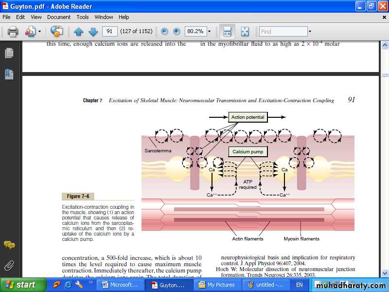 8. After a fraction of a second, the calcium ions are pumped back into the sarcoplasmic reticulum by a Ca++ membrane pump, and they remain stored in the reticulum until a new muscle action potential comes along; this removal of calcium ions from the myofibrils causes the muscle contraction to cease.