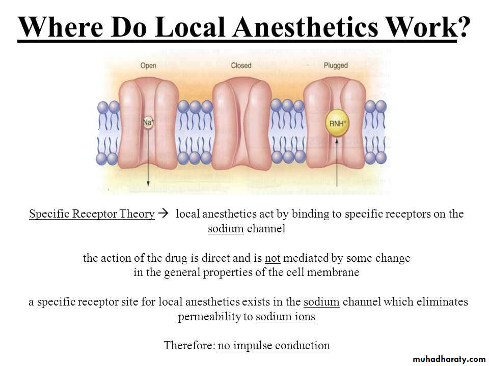 2. Specific receptor theory : this is most favored theory today , it proposes that local anesthetics act by specific receptors in the sodium channel (protein channel along the membrane) in the nerve membrane , once the local anesthetics has gained access to these receptors permeability to Na ions is decreased or eliminated and nerve conduction is interrupted.