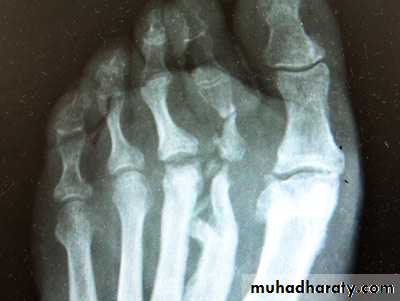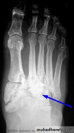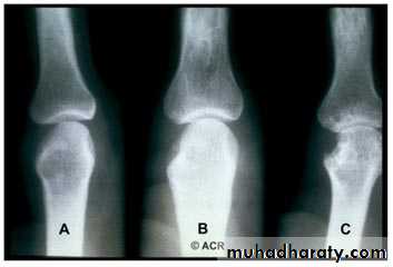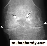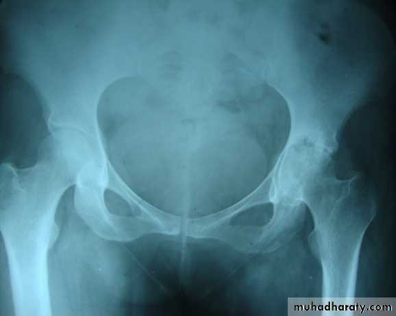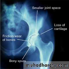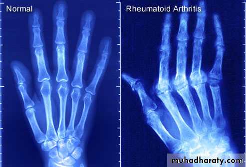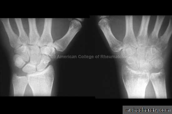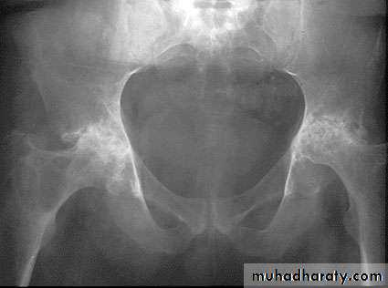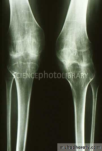 Hip & knee joint are most commonly affected joints radiological features1.Joint space narrowing 2.Erosions which may cause extensive destruction of the articular cortex 3. Severe osteoporosis 4. In later stages there may be gross disorganization of the joint with calcifiy debris near the joint.