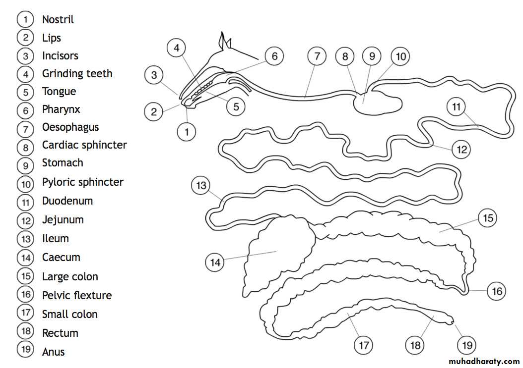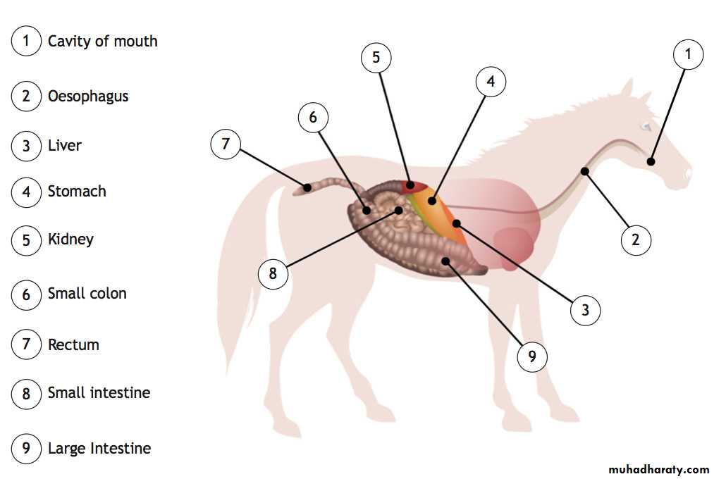 The horse’s digestive system starts at the mouth and ends at the anus. It is one continuous length and is extremely long so it must loop and coil to be able to fit inside the small amount of space left over by the large lungs and diaphragm.