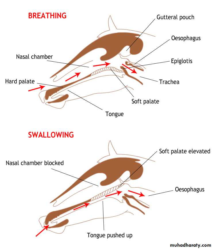 When eating and swallowing food the soft palate becomes raised and opens the passage to the oesophagus. The epiglottis folds back to cover the opening to the trachea, preventing food from entering the trachea which could prove fatal.