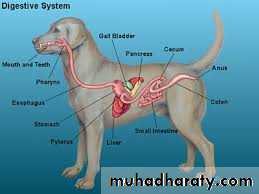 Dog have hinged jaws and large teeth meant to ingest large chunks of meat, it has shortest digestive tract of all mammals, digestion take about 8-9 hr.Stomach play major role in digestion, so it need high level of HCl