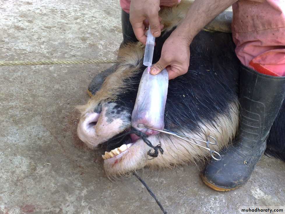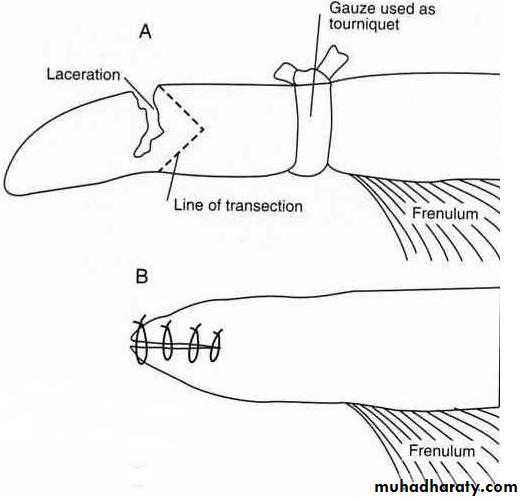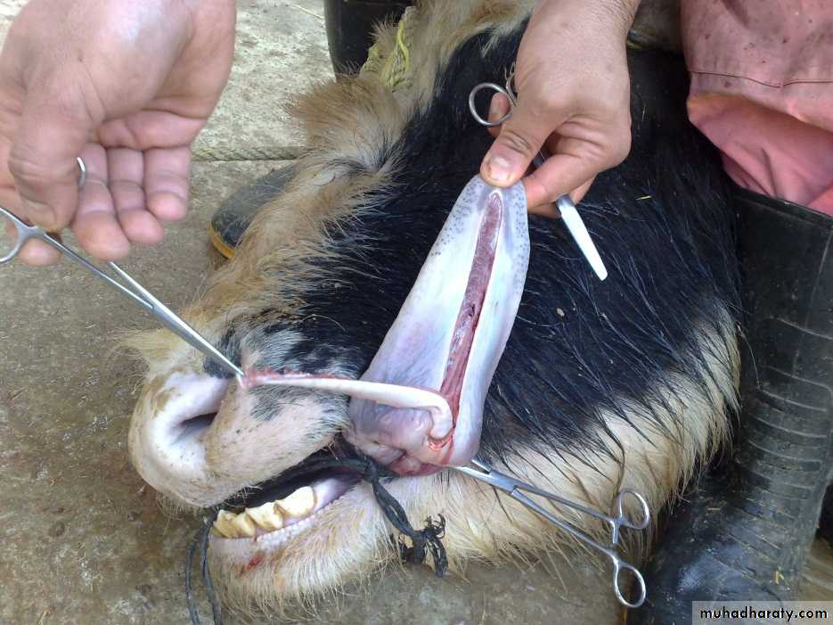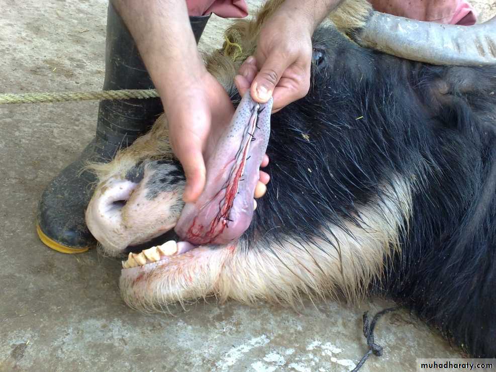 Lacerations:- can occur after street accident or by sharp tooth fragment, if laceration are deep, suture under G.A. and a tension suture (vertical mattress) and non absorbable suture material are used. In case of severe laceration partial glossectomy was done. Amputation in cattle must be avoided because of the loss of prehensile function of the tongue.