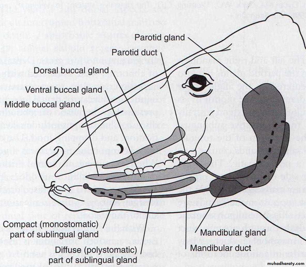 the parotid, mandibular, sublingual, and the zygomatic glands, which are the dorsal buccal glands in other animals.The parotid gland is the largest of these glands and occupies the space between the vertical ramus of the mandible and the wing of the atlas. The parotid duct (Stenson's duct) is formed by three or four radicles and leaves the gland ventrally about 2.5cm above the external maxillary vein.