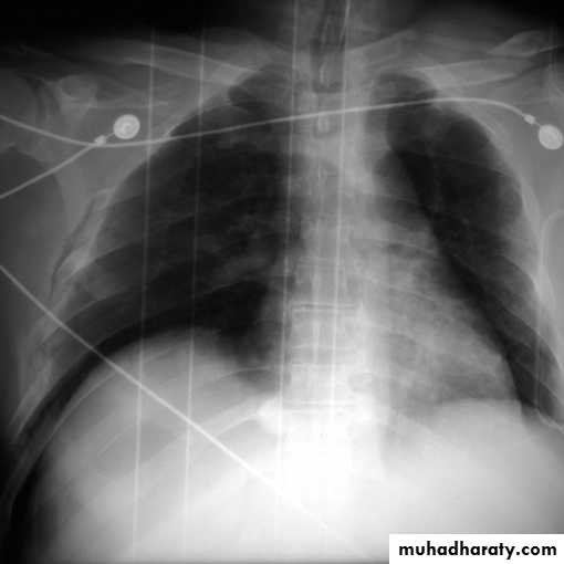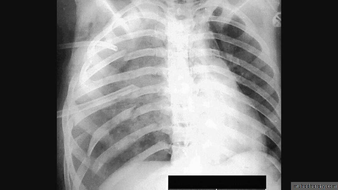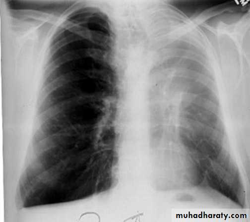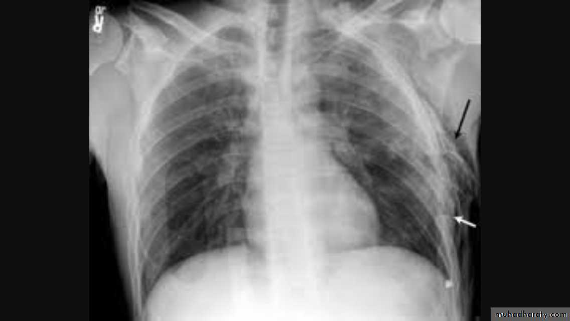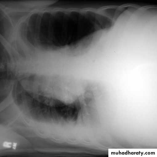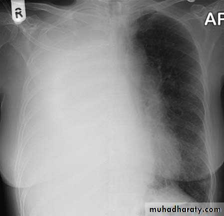 Radiopaque hemi-thoraxPneumothorax (air in pleural space )