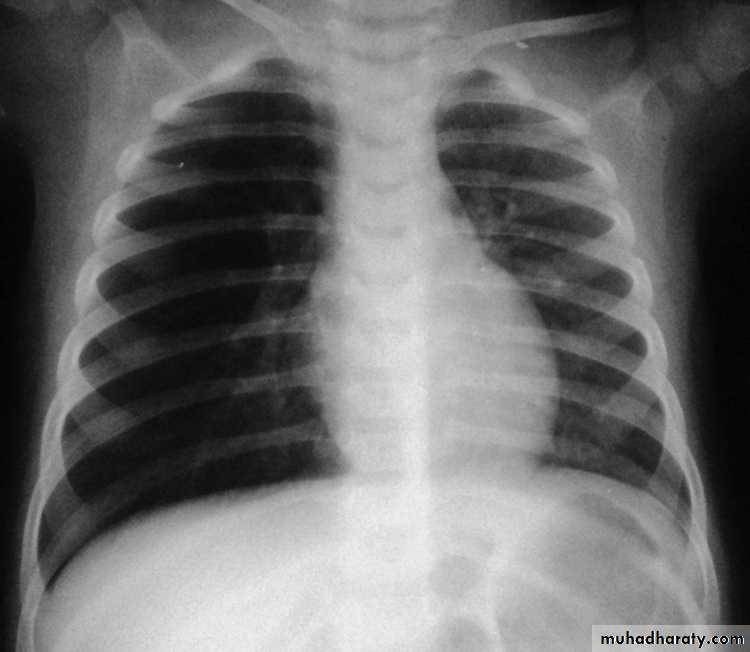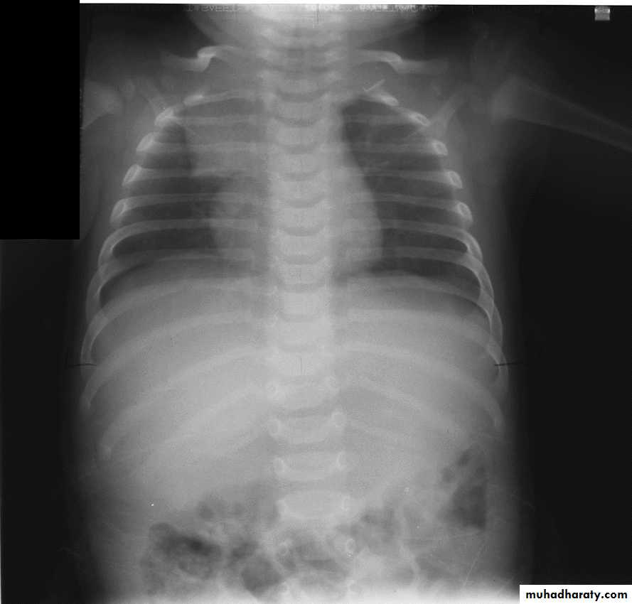 Gastric air bubble on the left & liver on the Rt2/3 of the cardiac shadow lie to the left of midline & one third lie to the Rt