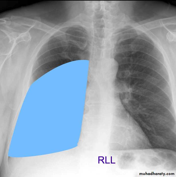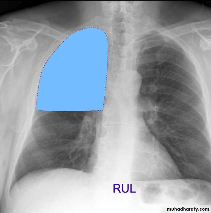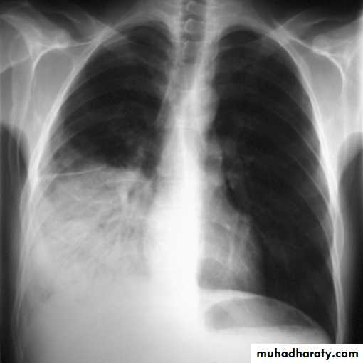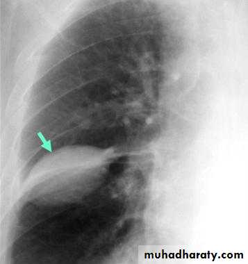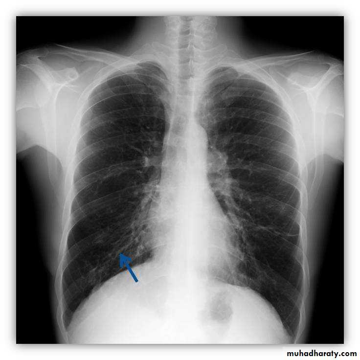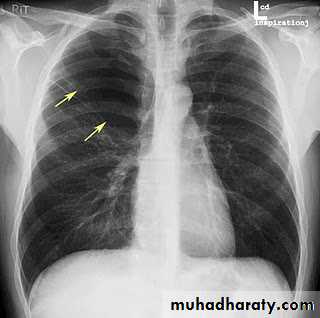 (infrapulmonary effusion) accumulation of fluids between the lung & visceral pleura ..The following features are helpful :elevation of the hemidiaphragm ..right: peak of the hemidiaphragm is shifted laterally