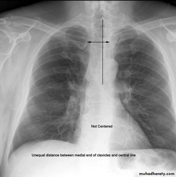 Both medial ends of clavicles are equi-distance from spinous process of adjacent vertebra .In rotated film , one side of the lung appear more opaque than the other with distortion of mediastinal borders.