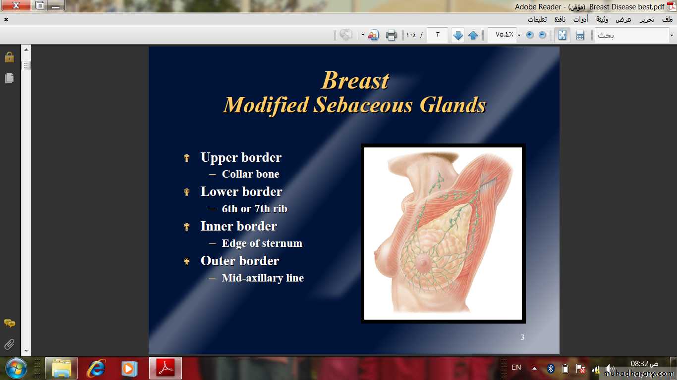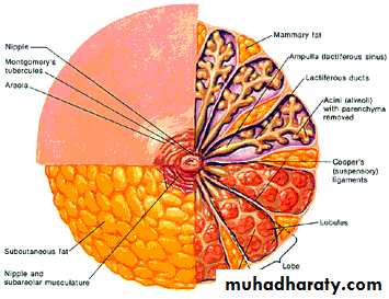 Mammary tissues anatomically represent mature modified sweat glands.• The Mammary gland Lies between the superficial and deep layers of the pectoral fascia of the chest wall.