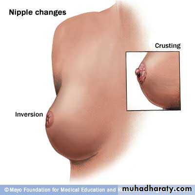 The nipples are inspected for the presence of retraction, inversion, or excoriation.